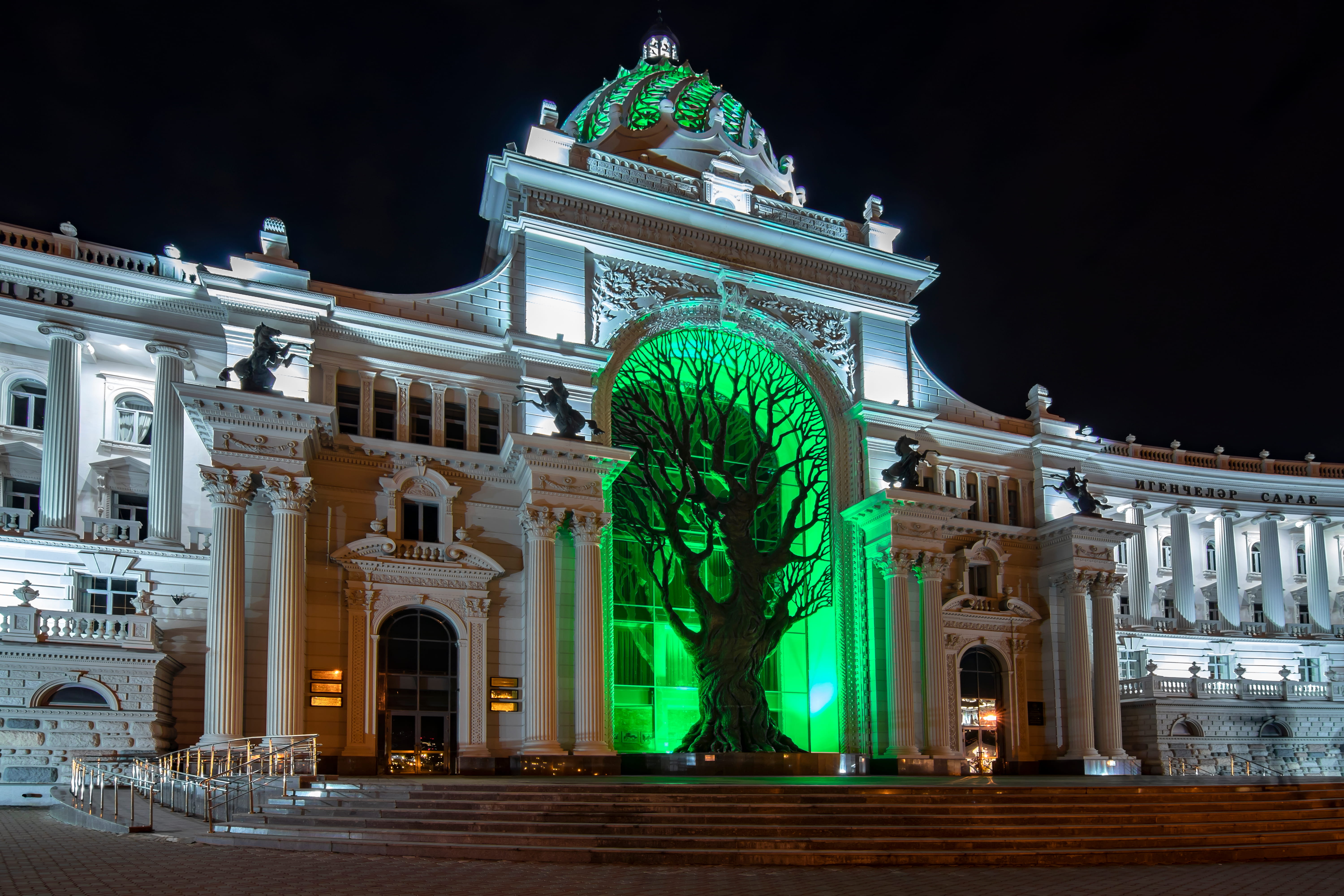 После Кремля можно свернуть на набережную и дойти до Дворца земледельцев. Здание привлекает туристов своим необычным видом — роскошный дворец в стиле эпохи ренессанса с огромным 20-метровым деревом из бронзы в центре. Особенно эффектно все смотрится вечером, когда включается подсветка.